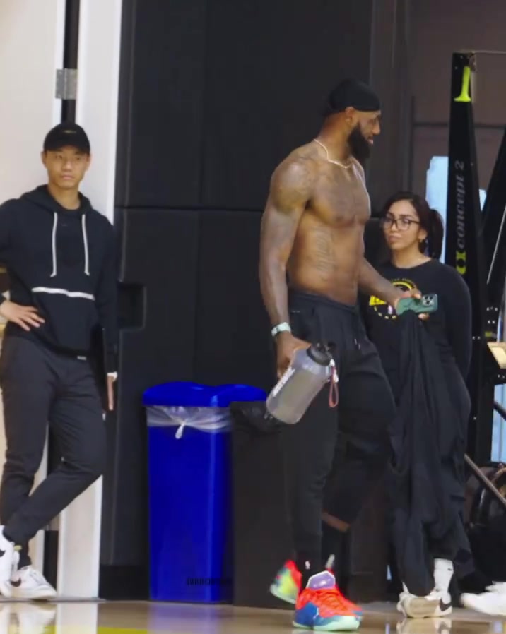 湖人训练片段:詹姆斯赤膊提着水壶与范德比尔特交谈