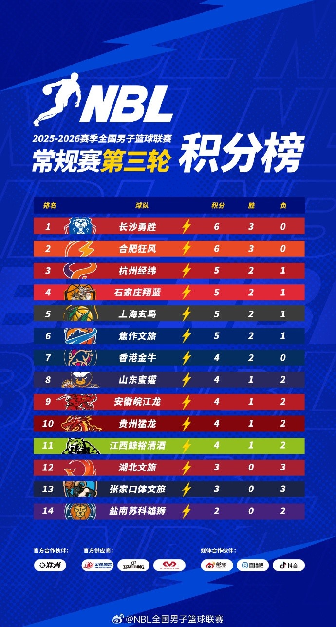 【积分榜】2025-2026赛季NBL常规赛积分榜(截至第三轮结束)。