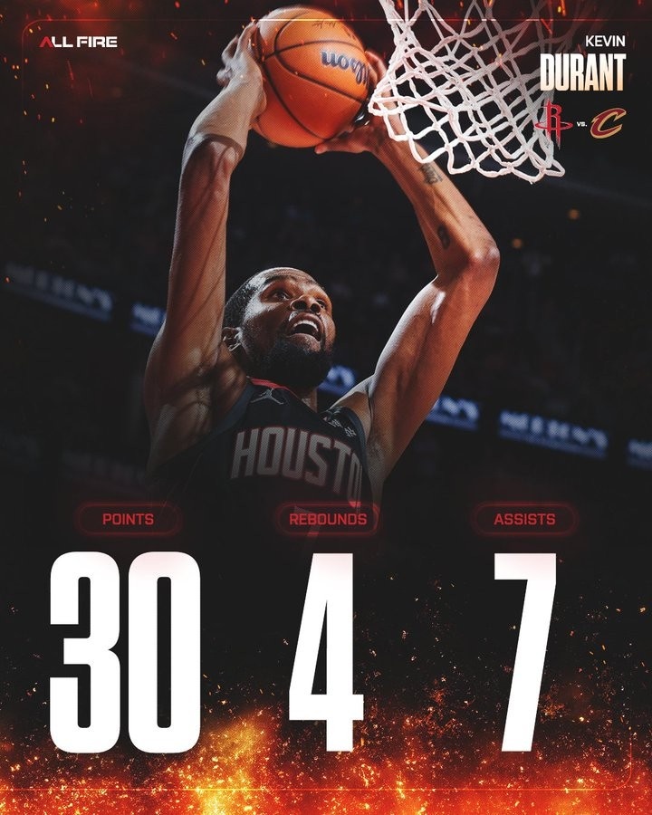 赛后,火箭官方晒图,发布杜兰特本场30+4+7的数据海报。