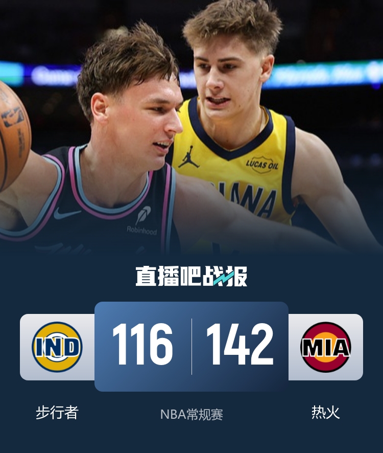 直播吧12月28日讯 NBA常规赛激战正酣,步行者和热火两支东部球队直接对话,热火16胜15负暂列东部第8位,步行者则苦吞7连败,6胜25负全联盟垫底。