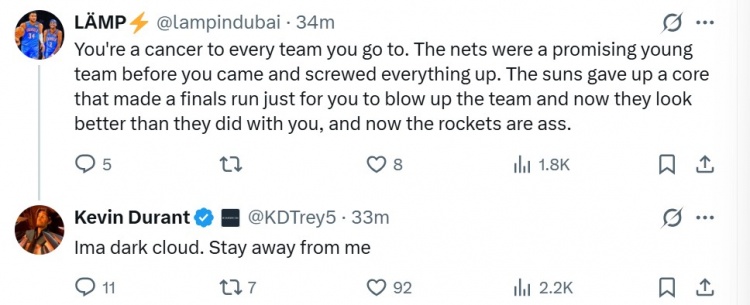 网友: 你到哪支球队都会成为毒瘤。在你加入之前,篮网是一支充满希望的年轻球队,但你却把一切都搞砸了。太阳为了你放弃了曾打入总决赛的核心阵容,结果你却让球队分崩离析,现在他们看起来比有你在时还要好。如今火箭也成了烂队。