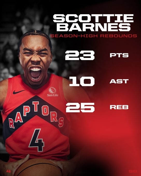 神兽级表现!猛龙晒巴恩斯数据海报:23分10助攻25篮板