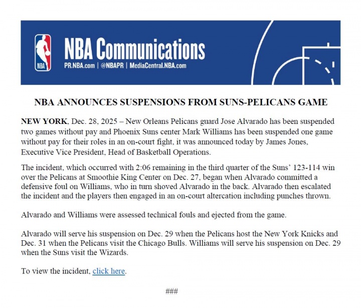直播吧12月29日讯 NBA今日官宣,对昨日太阳VS鹈鹕比赛中打架的阿尔瓦拉多以及马威禁赛,其中阿尔瓦拉多被禁赛2场,马威被禁赛1场。