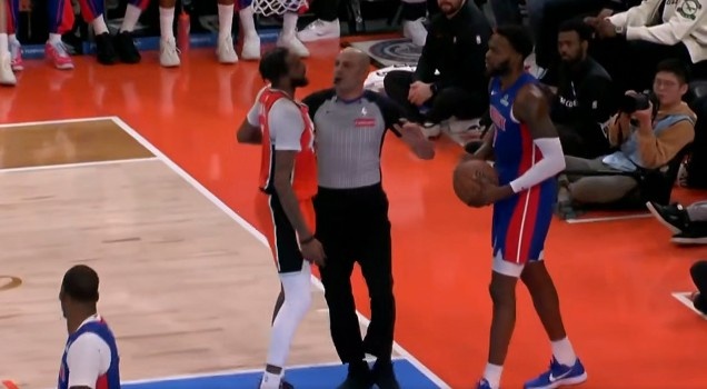 >裁判站中间呢!小琼斯突破被保罗·里德推下 险些冲突被制止