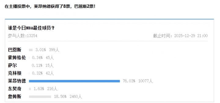 在主播投票中,莱昂纳德获得了8票,巴恩斯2票!