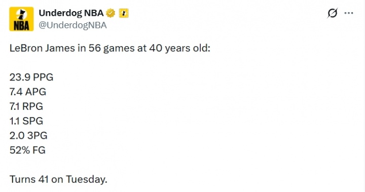 这可是40岁啊!詹姆斯40岁数据:场均23.9分7.1板7.4助 命中率52%