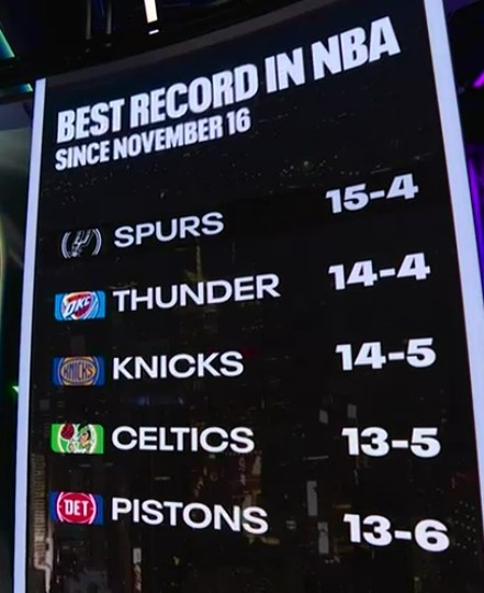 马刺主场迎战骑士,转播方晒出近一个半月(11月16日至今)的战绩排名: