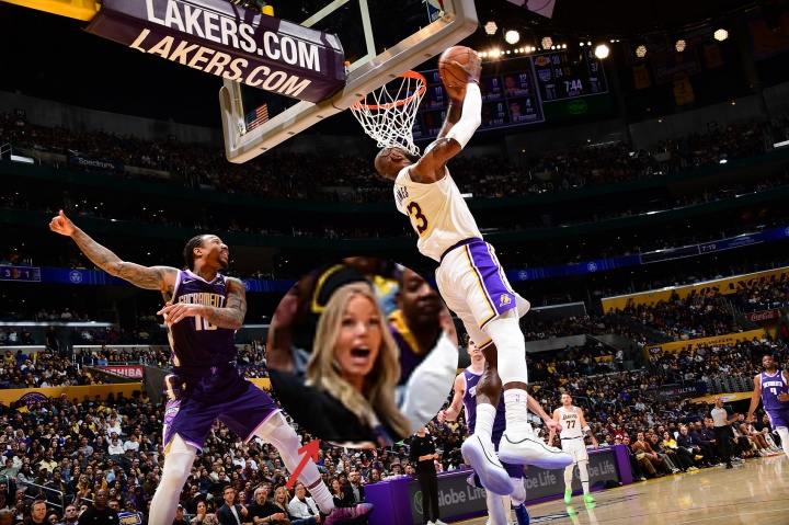 詹姆斯背身反扣还没扣进之前 场边的珍妮·巴斯已经张大了嘴巴!