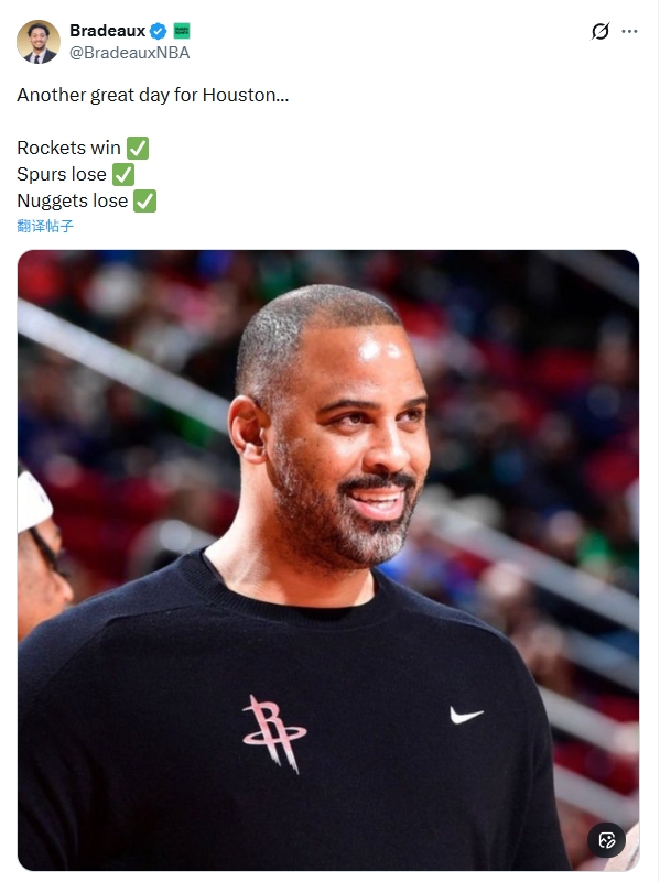 火箭媒体人Bradeaux晒出球队主帅乌度卡的微笑图,并写道:“对休斯敦(火箭)而言,又是美好的一天。火箭赢球,马刺输球,掘金告负。”