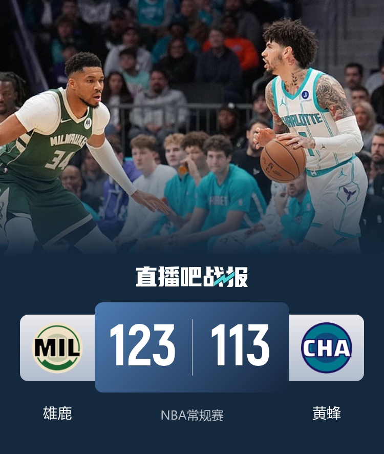 比赛开始,字母哥连续篮下送暴扣带队打开局面,三球外线也能给出回应,黄蜂替补上来追分并在首节反超1分,次节双方拉锯战,雄鹿突然断电,塞克斯顿连中3记三分带领黄蜂轰出17-2反超双位数,但罗林斯连续三分单节上双追到差3分。下半场,双方回到同一起跑线,米勒苦苦支撑,特纳状态回暖,雄鹿众将连续造杀伤三节反超6分,末节波蒂斯连续3记三分助雄鹿一波小高潮领先到双位数,字母哥内线终结一球不丢,黄蜂无力回天,最终雄鹿123-113力克黄蜂。