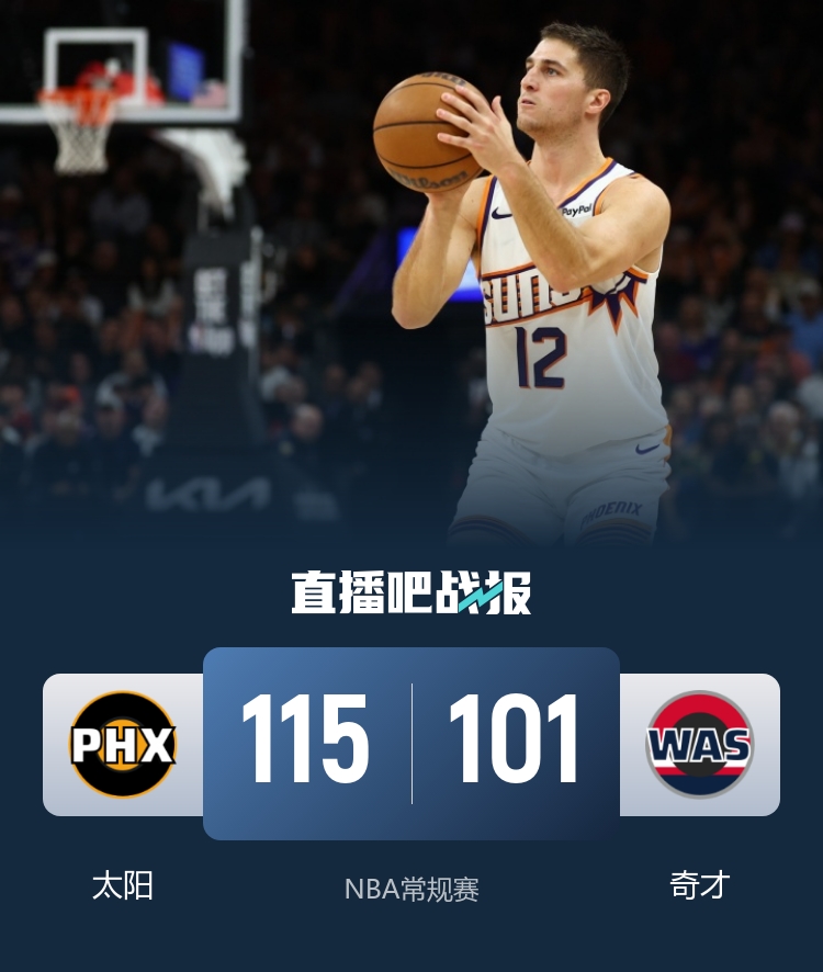 上半场,吉莱斯皮和奥尼尔相继三分穿针,奇才轮番冲击内线给出回应,布克和狄龙手感不佳,特雷·约翰逊高效输出,古德温不断拼抢前场篮板补篮拿分,次节太阳进攻回暖,狄龙连得5分,布克三分也有帮助球队占据场上主动,半场战罢太阳61-54领先奇才。下半场,太阳火力全开,打出16-3的攻击波取得两位数领先,麦科勒姆攻防两端发力带队追赶,末节太阳稳扎稳打将优势保持到最后。最终,太阳115-101击败奇才。