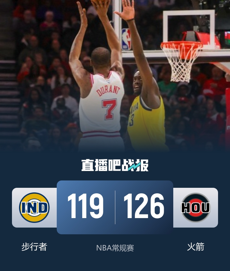 比赛开始,杜兰特高效输出带队打出12-3的开局,随后步行者展开反击,外线开火连中三分强势反超,杜兰特和奥科吉相继三分穿针稳住局势,次节火箭多点开花打出9-0的攻击波取得两位数领先,步行者命中率持续下降,伊森反击得手将分差拉开到20分,半场战罢火箭66-48领先步行者。易边再战,两队围绕20分的分差展开争夺,内姆哈德飙中三分,火箭持续发力保持优势,步行者连续抢断反击打出8-0止血,火箭及时回暖完成8-0的攻击波还以颜色,末节火箭稳扎稳打将优势保持,步行者10-0攻击波但为时已晚。最终,火箭126-119击败步行者,取得3连胜的同时送给对手9连败。