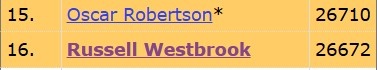 目前,国王球星威少生涯总得分为26672分,距离前一位的奥斯卡·罗伯特森仅差38分,后者也是NBA历史控卫得分王。