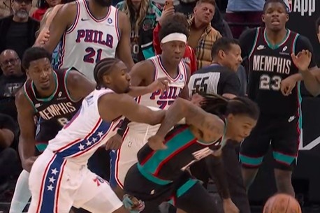 >很关键!莫兰特抢球出界 灰熊挑战失败&依然是76人球权