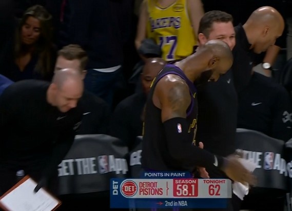 >老熟人了!詹姆斯与场边活塞助教小沃顿交流嬉笑