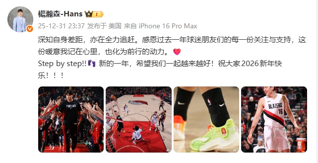 他写道:“深知自身差距,亦在全力追赶。感恩过去一年球迷朋友们的每一份关注与支持,这份暖意我记在心里,也化为前行的动力。❤️Step by step!!👣 新的一年,希望我们一起越来越好!祝大家2026新年快乐!!! ”