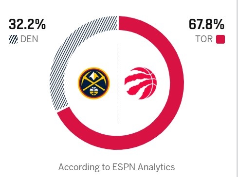 赛前ESPN给出了本场的获胜概率预测,掘金32.2%,猛龙67.8%。