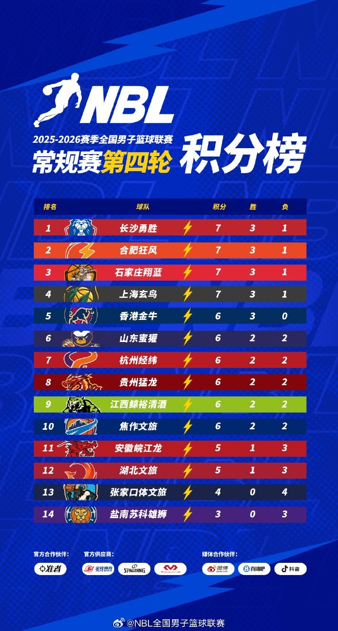 【积分榜】2025-2026赛季NBL常规赛积分榜(截至第四轮结束)