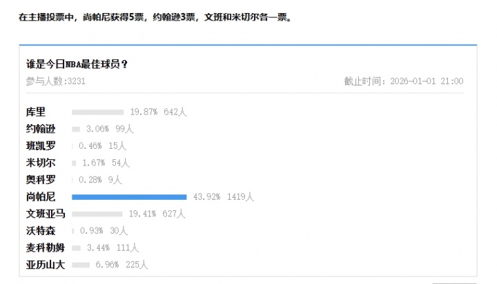 在主播投票中,尚帕尼获得5票,约翰逊3票,文班和米切尔各一票。