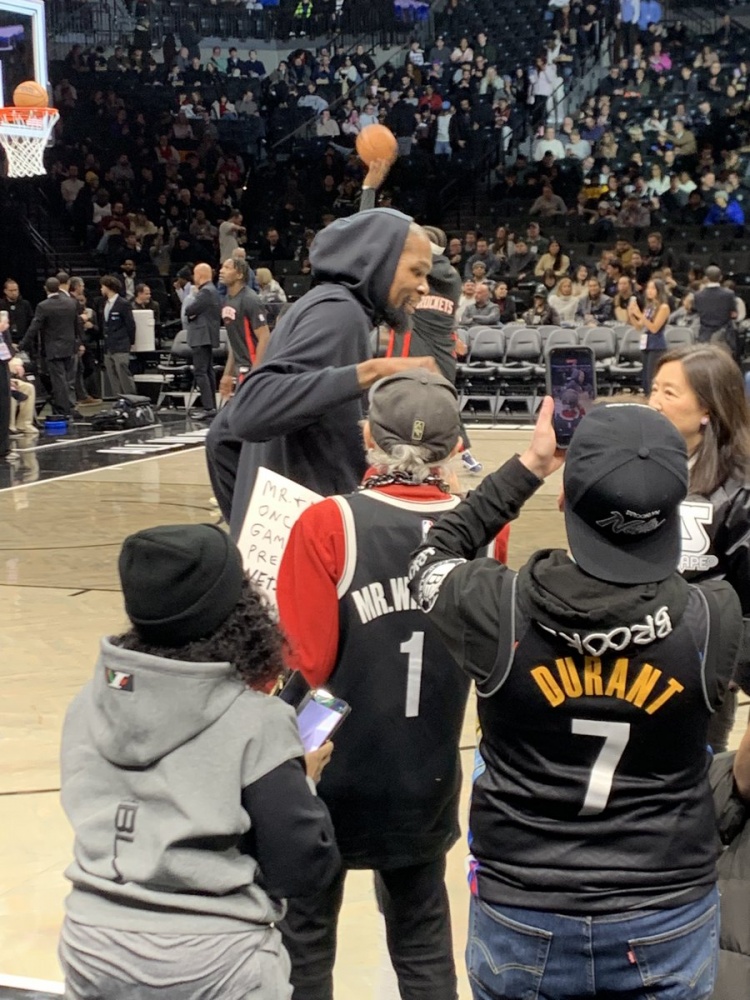 赛前,杜兰特与篮网死忠老球迷Mr Whammy亲切交流,并