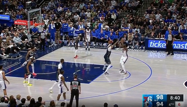 >手感真可以!恩比德罚球线附近接球连续虚晃 顶着浓眉中投空心中