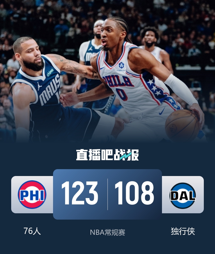 比赛开始,双方上来大打对攻战,进攻端手感都不错,随后弗拉格接连反击送暴扣,独行侠首节建立6分领先,次节76人多点开花,上来就轰出17-2攻击波反超比分,随后双方连续走上罚球线,克里斯蒂联手弗拉格止血,但76人还能回应保持双位数领先。下半场,双方命中率都有下降,但分差还是保持在10分左右,独行侠替补能上来咬住比分,三节独行侠落后9分,末节独行侠连续追分,但马克西联手恩比德还能给出回应,76人重新领先双位数,埃奇库姆大帽加三分杀死比赛,最终76人123-108力克独行侠。