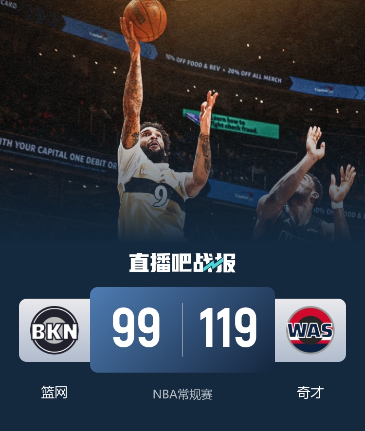 比赛开始,篮网从内线打起,奇才则是外线连续发炮并很快建立主动权,随后双方围绕10分左右分差拉锯,贾斯汀·尚帕尼压哨三分领先13分,次节奇才继续发力扩大领先,篮网全民皆兵追分,但奇才还能回应保持住双位数领先。下半场,双方围绕着10分左右分差展开拉锯战,随后奇才一波10-0直接拉开20分以上领先,末节奇才牢牢保持住20分左右领先,篮网无力回天,最终奇才119-99轻取篮网。