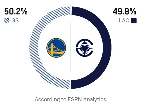 ESPN预测本场胜率,快船49.8%,勇士50.2%。