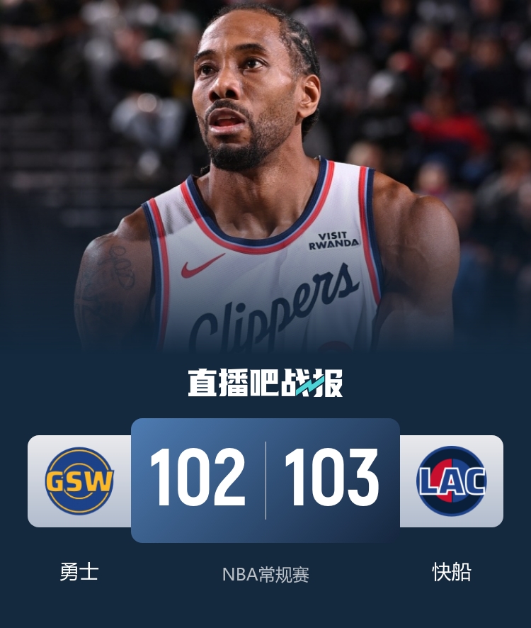 比赛上来,快船先拿两分后被勇士连拿六分打停,回来后快船成功限制住对手的攻势,让勇士首节只拿到19分,次节快船的命中率有所下滑,而勇士这边库里状态回暖,单节独得12分带领勇士追分,半场结束时快船的优势仅剩4分;下半场回来,勇士的进攻又遇到麻烦,单节仅有13分,快船一波8-0的小高潮再次将分差拉开到两位数,末节勇士虽有追分势头但快船总能给出回应,科尔因不满判罚怒喷裁判连吃两T遭驱逐,紧要关头库里连中三分球打回悬念,不过他篮板犯规个人六次只能下场,关键时刻莱昂纳德三分不中留给勇士机会,巴特勒绝杀后仰跳投也是三不沾,最终快船险胜勇士拒绝连败。