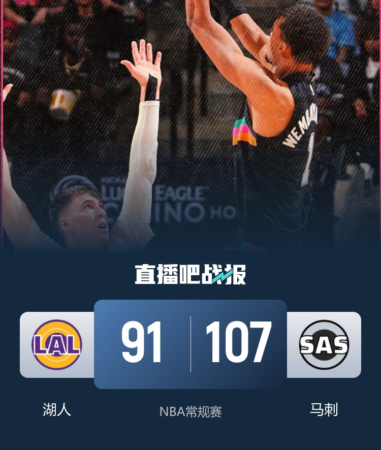 比赛开始,马刺率先发力,多点开花打出14-7的开局,东契奇得分助攻一肩挑带队追赶,文森特三分扳平比分,次节湖人展开反击,艾顿抛投得手帮助球队完成11-0攻击波强势反超,马刺连投带罚稳住局势,半场战罢湖人43-48落后马刺。易边再战,马刺稳扎稳打将分差拉开到两位数,东契奇依靠个人能力带队支撑,末节湖人连中三分迫近比分,哈珀反击扣篮稳住局势,东契奇独木难支,马刺稳扎稳打将优势保持到最后。最终,湖人91-107不敌马刺,客场落败。