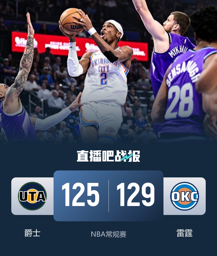 刚开场两队打得有来有回,比分也是交替上升,第一节尾声亚历山大带回打出一波攻势建立领先。第二节上来雷霆轮换阵容全面开花,外线也是连中三分,一度将场上分差拉大到20分。马尔卡宁重新登场后为爵士止血,乔治也连续回应拿分,爵士逐渐缩小分差。易边再战,爵士延续追分势头,雷霆没有支撑多久后被爵士反超比分,亚历山大挺身而出连续打成2+1未雷霆稳住局面,并且重新夺回领先。最后一节雷霆进攻再度出现问题,运动战接连打铁,爵士则是一鼓作气完成反超并扩大优势。此后雷霆三少轮番拿分帮助雷霆追上比分,在还剩3秒时马尔卡宁极限补篮帮助爵士领先2分,亚历山大中投压哨命中将比赛拖入加时。加时赛中两队依旧打得十分胶着,霍姆格伦关键补扣得手,爵士三分不中,随后雷霆罚球稳健收下比赛,最终雷霆加时力克爵士止2连败,爵士遭遇5连败。