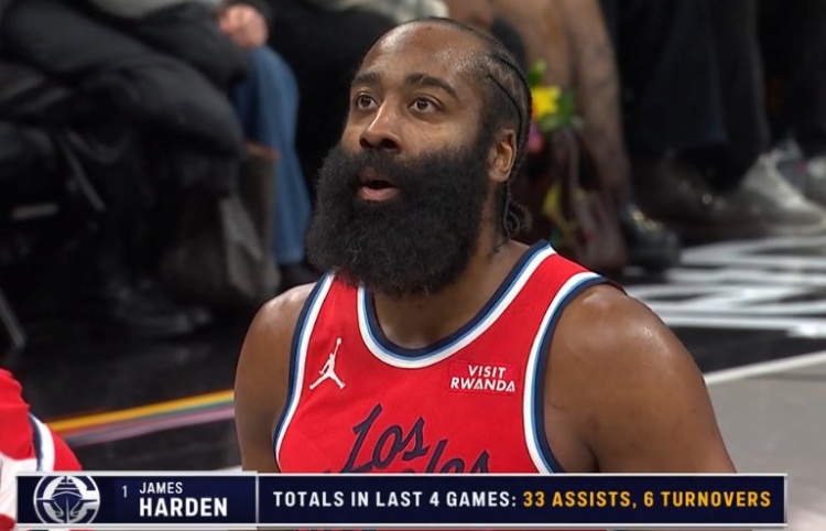 >稳健控场!哈登过去4场送出33助攻有6失误 助失比5.5:1