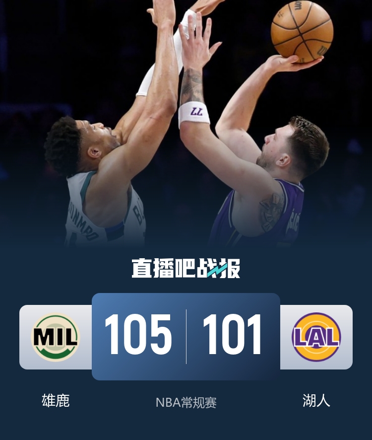 比赛开始,东詹联手带队打出8-2开局,但湖人连续失误,AJ·格林接连三分助队反超,范德比尔特三分回应,双方拉锯战,凭借詹姆斯罚球湖人领先1分,次节双方对攻比分交替领先,湖人进攻突然停滞,雄鹿多点开花打出小高潮领先到双位数。下半场,湖人上来连续三分咬住比分,但字母哥冲击始终挡不住,双方围绕10分左右领先继续拉锯战,东契奇连续犯规累积5犯,末节詹姆斯发力,里突外投加抢断加助攻带队一波流直接反超,随后双方多次打平进入白热化,小波特关键三分造成东契奇6犯,詹姆斯致命失误,最终湖人101-105惜败雄鹿。