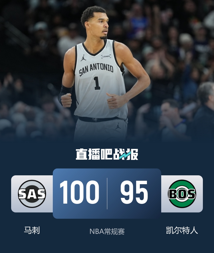 比赛开场,凯尔特人这边布朗主导进攻,连续打成,单节砍下12分,马刺这边则是众人发力,但外线打铁太多,首节结束凯尔特人26-21领先。次节回来,马刺进攻状态回暖,连续在禁区取分,不过怀特面对旧主手感火热,单节狂砍15分,帮助球队维持分差,半场结束凯尔特人55-50保持领先。易边再战,文班在攻防两端发力,马刺一度追平比分,凯尔特人这边攻击禁区受阻,仅依靠外线投射止血,还是以75-73领先进入第四节。末节回来,双方陷入拉锯战,凯尔特人始终保持微弱领先,终场前最后两分钟马刺95-93取得反超,随后尚帕尼再补进领先到4分,凯尔特人没能再反超回来,比赛盖棺论定,马刺100-95险胜凯尔特人。