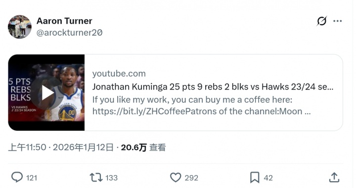 库明加的经纪人在本场赛后,晒出了库明加23-24赛季面对老鹰砍下25分9板2帽的精彩集锦,那场比赛勇士134-112最终战胜老鹰。