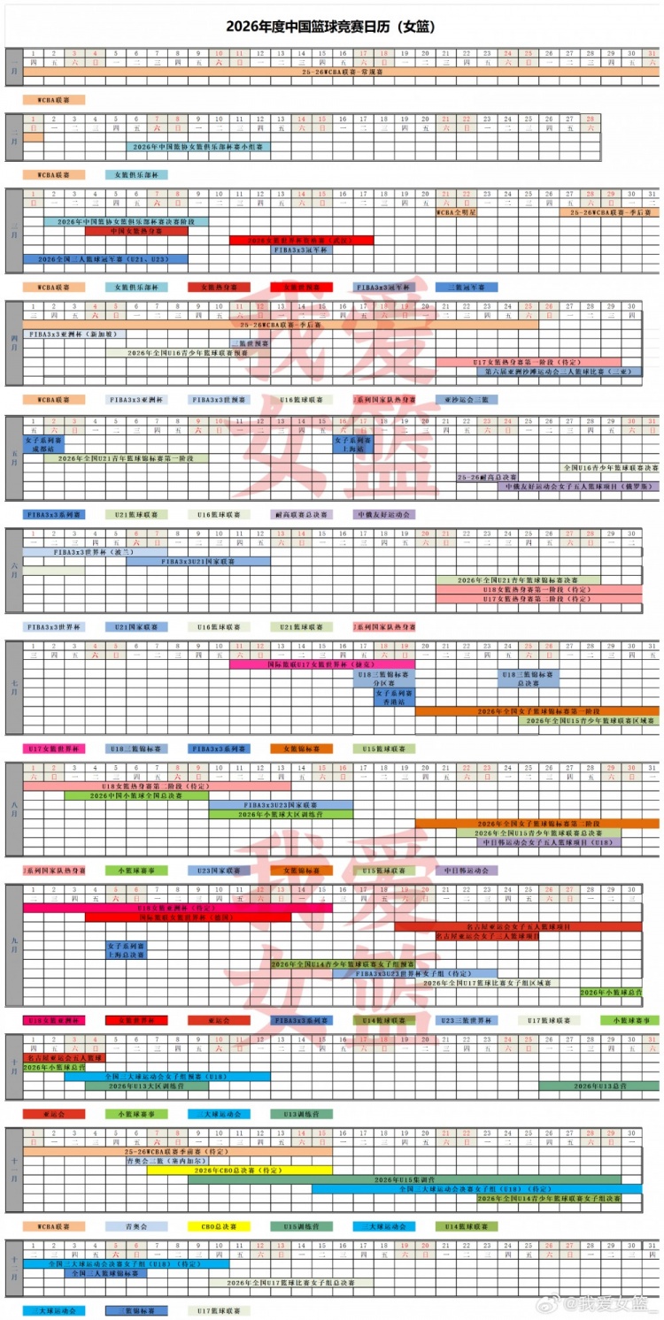 【2026年度中国篮球竞赛日历(女篮)】日前,中国篮协发布了2026年度中国篮球竞赛日历(简称“赛历”),涵盖了国际赛事、体育总局赛事、职业联赛、专业赛事和其他赛事,共5大类赛事,将2026年一整年的大小赛事全部涵盖,信息量满满。我爱女篮也据此制作了女篮方向的赛历长图,方便网友和从业者直观了解,欢迎大家转发收藏。