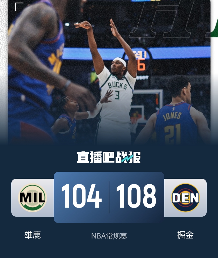 直播吧1月12日讯 NBA常规赛火热进行,掘金主场迎战雄鹿,穆雷和斯潘塞·琼斯继续缺阵,布劳恩因脚踝伤势同样缺席。