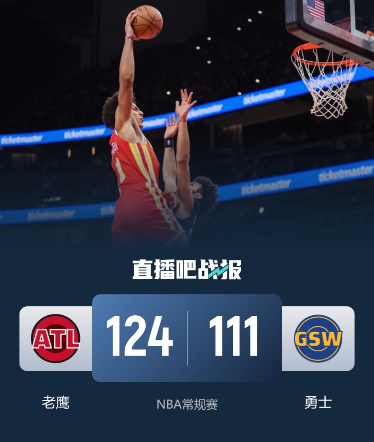 比赛上来,库里个人先拿四分,球队也在他的带领下迅速将分差拉开到两位数,不过老鹰及时调整回应一波7-0的小高潮,首节还剩六分钟麦科勒姆替补出战迎来老鹰首秀并迅速得分,之后两队展开了长时间的拉锯,凭借着麦科勒姆的压哨三分球,老鹰半场领先6分;下半场回来,老鹰逐渐将分差拉开到十分以上,不过勇士立马就用一波10-0成功咬住,但这个势头并没有延续太长时间,肯纳德在第三节末段突然爆发连续轰进多记三分球,末节分差已经突破二十分,勇士再追分也无济于事,最终老鹰轻取勇士迎来三连胜。