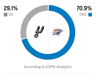 ESPN预测本场胜率:雷霆70.9%,马刺29.1%。