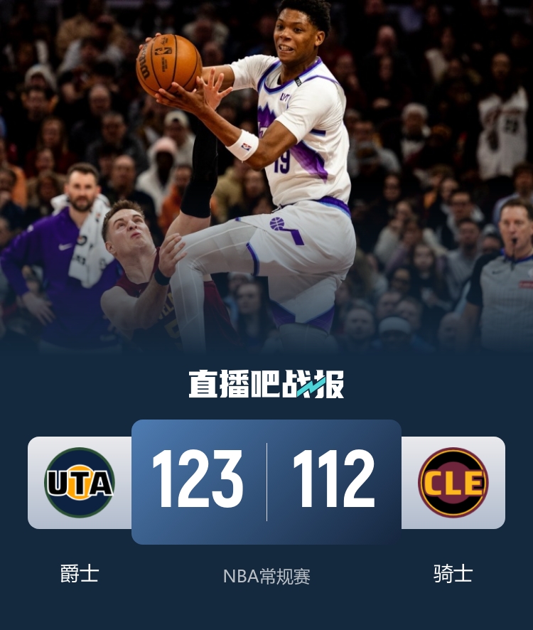 比赛开始,骑士上来连续失误,爵士接连反击加三分轰出19-2直接建立近20分领先,随后骑士回应10-2止血,但爵士连续三分还是领先12分,次节双方展开拉锯战,米切尔连续三分追至个位数分差,随后骑士继续外线发炮直接反超8分。下半场,乔治发力里突外投单节迅速上双,爵士顺势再反超回来,随后双方展开胶着拉锯战,三节爵士领先4分,末节爵士上来8-0扩大领先,双方展开拉锯战,爵士始终保持10分左右领先,最终爵士123-112力克骑士。