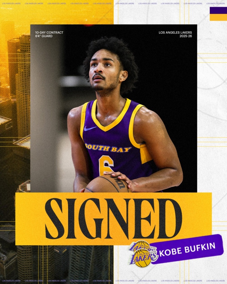 直播吧1月14日讯 今日湖人官方宣布,球队正式与后卫科比·巴夫金签下一份10天合同,他将身穿18号球衣。
