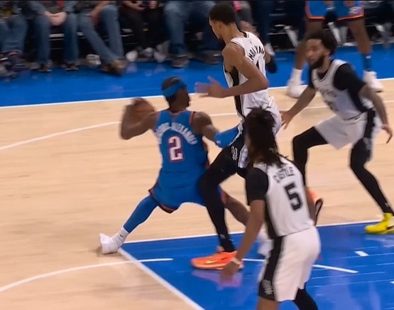 本场第二次!SGA突破动作过大吃进攻犯规 文班倒地捂膝盖下场休息
