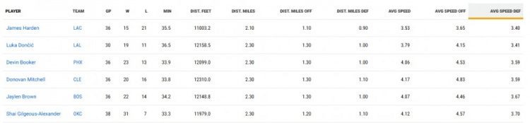 Tom Haberstroh这一说法确实有数据支撑,在NBA官网球员跑动能力的统计中,出场超过30场,场均30分钟以上的后卫里,哈登在防守端的平均速度是3.40英尺每秒,倒数第一;东契奇是3.41倒数第二,进攻速度和平均速度的排名也是如此,东契奇倒数第二,哈登倒数第一。