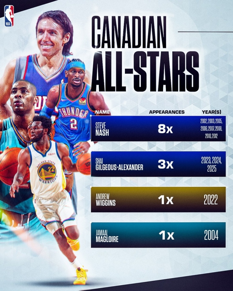 历史上,他们一共只有4人入选过全明星,分别是:纳什(8次)、亚历山大(3次)、维金斯和马格洛伊尔各1次。