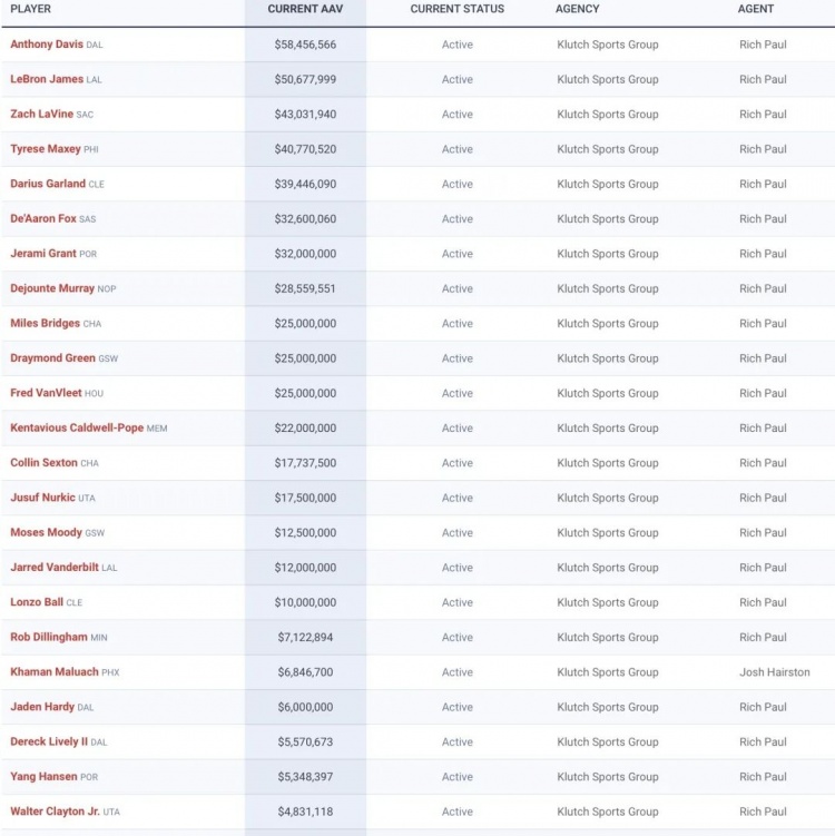 谈到里奇·保罗的商业帝国,他写道:“富保罗是美国职业体育界拥有客户最多的经纪人之一,仅NBA球员就有差不多30位,与CAA这样的大公司不同,Klutch公司几乎都挂富保罗自己的名字,代理的明星包括安东尼·戴维斯、詹姆斯、追梦、马克西等,还有我们的杨瀚森。他代理的各项目球员所有工资加起来可以达到70亿,按4%的代理费计算,仅2026年就高达2.8亿。”