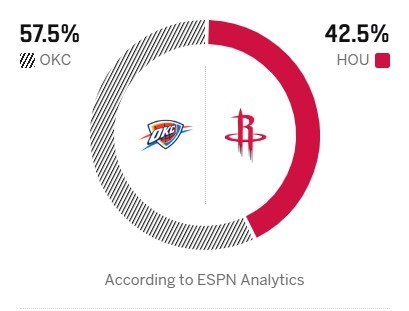 ESPN预测明日胜率:主队火箭42.5%,客队雷霆57.5%。