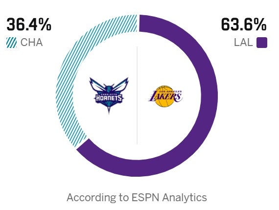 今天,ESPN预测本场胜率,湖人63.6%,黄蜂36.4%。