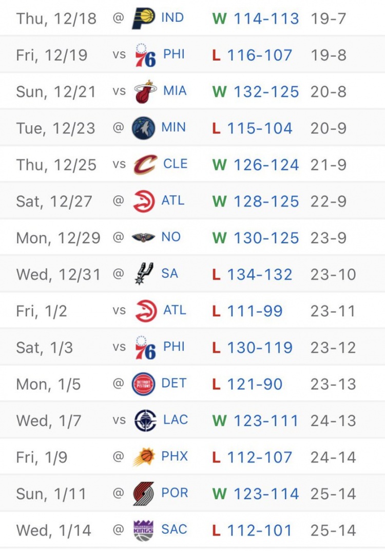 此役过后,尼克斯自NBA杯夺冠后仅取得7胜8负。