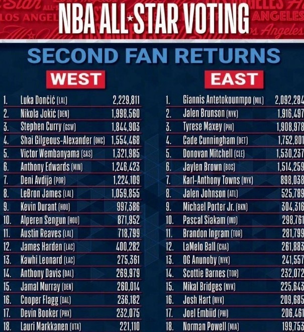 全明星投票第二轮KD在西部第九位