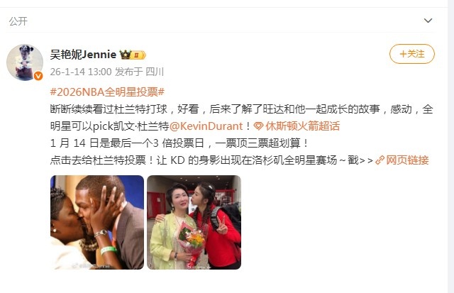 “#2026NBA全明星投票#断断续续看过杜兰特打球,好看,后来了解了旺达和他一起成长的故事,感动,全明星可以pick凯文·杜兰特@KevinDuran!”吴艳妮写道。